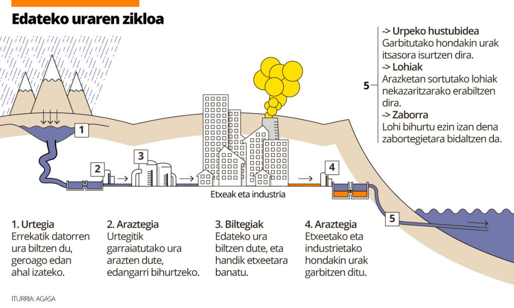Hala ere, menditik itsasora doan ura erabili egiten dute gizakiek, eta, horregatik, edateko uraren zikloa asmatu dute. Ibaiek urez hornitzen dituzte urtegiak, eta kanalen bidez araztegietara bideratzen da ur hori guztia. Araztegietan garbitu egiten dute, araztu, gero edan ahal izateko. Beharrezko tratamenduak eginda, hiri eta herrietako biltegietara garraiatzen da ura. Biltegi horietatik ateratako adarren bidez iristen da ura etxeetako eta industrietako txorrotetara.